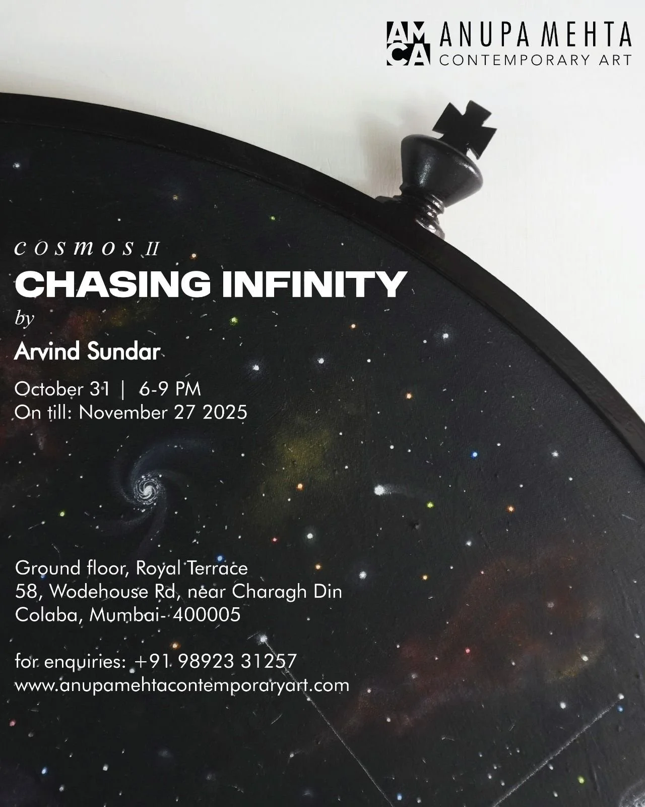 Chasing Infinity — the second edition of Arvind Sundar’s Cosmos series — reimagines the game of chess as a metaphor for the universe. The chessboard becomes a microcosm of the cosmos, where mathematics, mythology, and mystery converge. The works invite the viewer to ponder vast numbers and infinite possibilities — to see cosmology not as something distant, but as a force shaping our everyday lives.